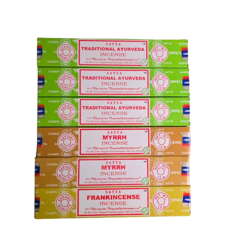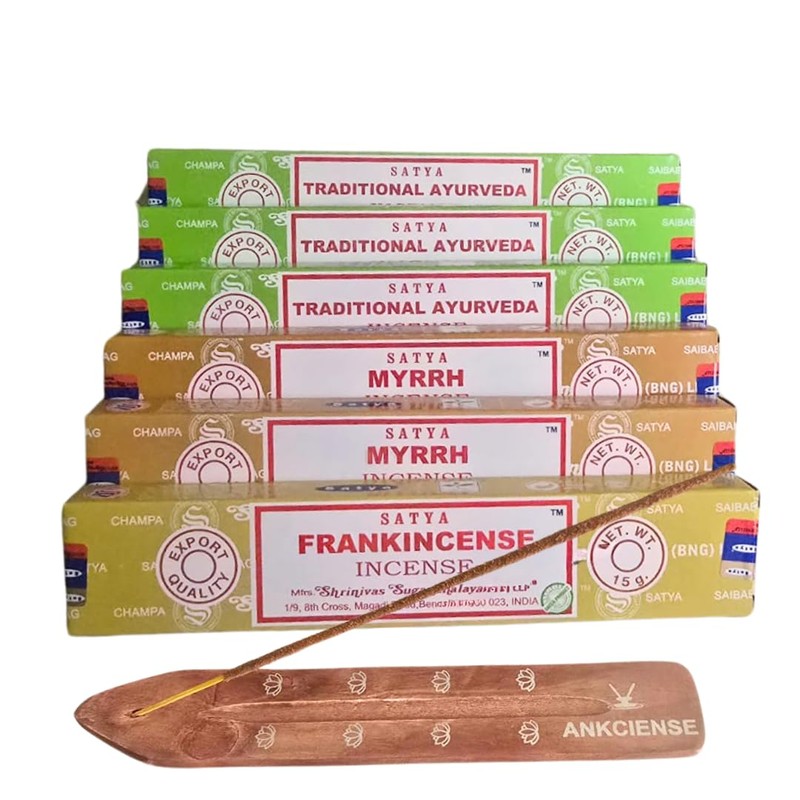 Satya Traditional Aurveda, Myrhh & Frankincense with ANKCIENSE Incense Holder Pack of 3 fragrances Variety Pack of 90 Sticks