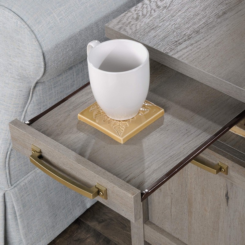 You're relaxing on the couch with your feet kicked up when you suddenly realize you have nowhere to set your refreshing ice-cold beverage. Not cool. But don't worry, we've Got an easy fix for that. You'll find a place for all YOUR couch side needs with this vintage looking side table from the cannery bridge collection. Its spacious top surface provides you with the ideal amount of space for items like an accent lamp, your smart phone, A picture frame and coasters too. If that's not enough, it also features a pull-out shelf that glides on smooth metal runners for additional surface space for that Bowl of popcorn you just popped. It also includes an open shelf for easy access storage of items like the TV remote and your reading Glasses. The large lower drawer provides you with additional storage space for miscellaneous household items that you don't want guests to see. Its finished on all sides for versatile placement so it can be used in any spot in any room of your home – even as a bedside table! Finished in Mystic oak, this charming end table adds the perfect pop of classic style to your home.