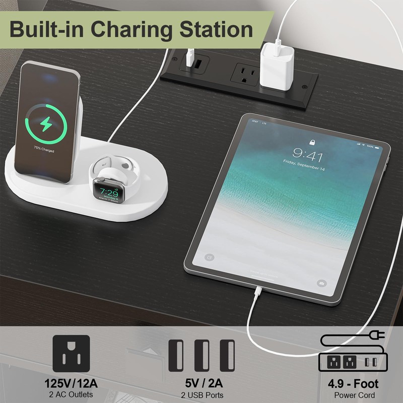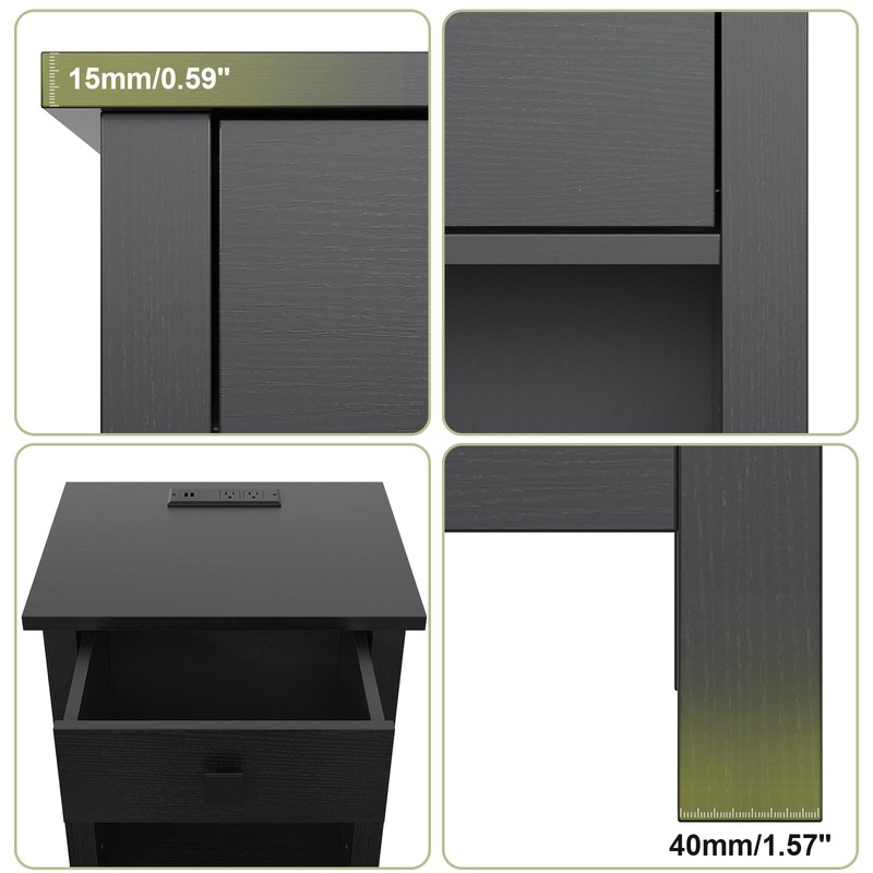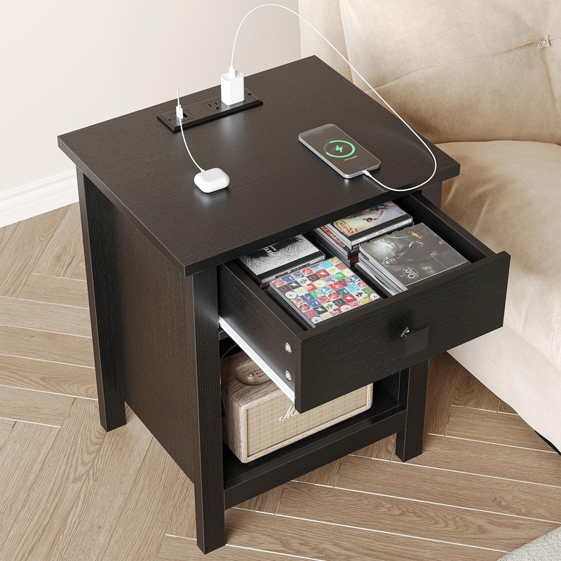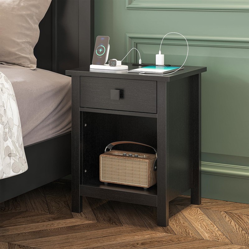 - ①【Nightstand with Charging Station】This nightstand with a drawer offers 2 AC outlets and 2 USB ports, providing you with more charging options at bedtime. You can conveniently charge your phones and power up your lamps with ease.