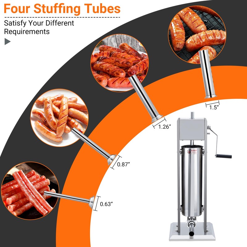- 【4 Filling Tubes】 This vertical sausage stuffer comes with four 304 stainless steel stuffing tubes (Inner Diameter: 14mm, 20mm, 30mm, 36mm ; Outer Diameter: 16mm, 22mm, 32mm, 38mm) and fried dough sticks, which can meets different size requirements, great for making snack sticks, sausages, hot dogs, churns, etc.