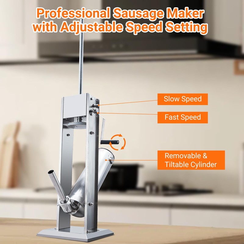 - 【Adjustable Two Speeds】Our sausage stuffer machine has two adjustable filling speeds with removable regulating handle. High speed is suitable for filling sausage and low speed is used for filling sausage casings.