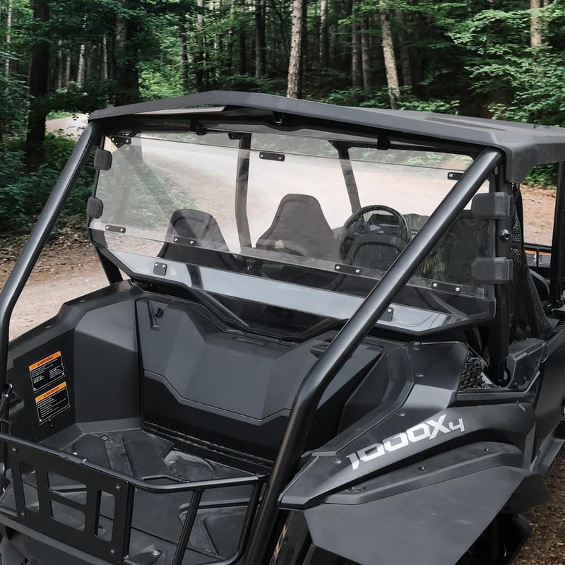 - All-Weather Protection & Comfort: Prevents wind, leaves, and debris from flying directly into the cab, keeps the interior of the UTV dry and tidy. Besides, the windshield keeps you warm in winter, and prevents dust and rain in summer