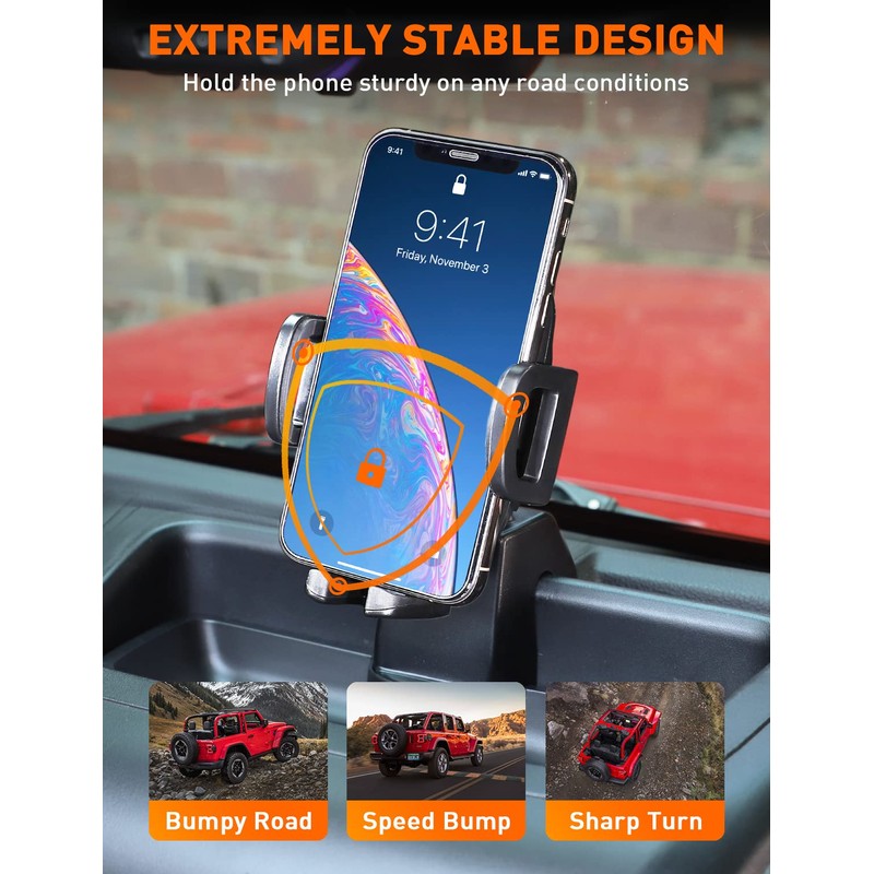 - PERFECT FITMENT -- Savadicar jk phone mount is specially designed according to the original wrangler dash tray data, firmly fixed to keeps your hands free for safe navigating on open roads or rough terrain.