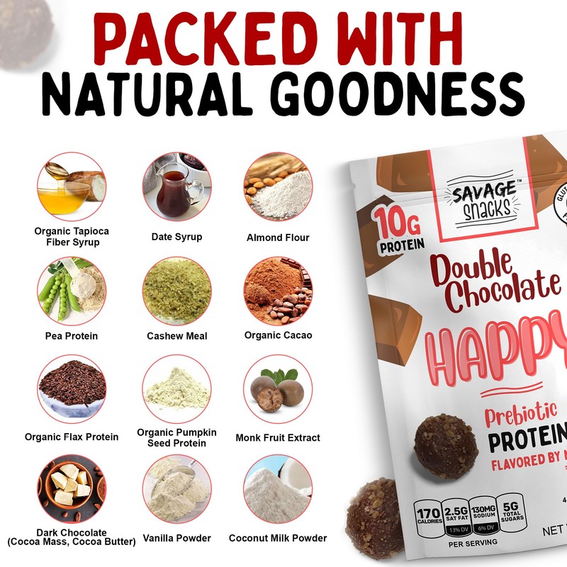 Savage Snacks Happy Double Chocolate Whole Food Prebiotic 10g Protein Balls & Bites - Convenient On-The-Go Tasty Protein Snacks - High-Protein, Gluten-Free, Grain-Free & Flavored by Nature