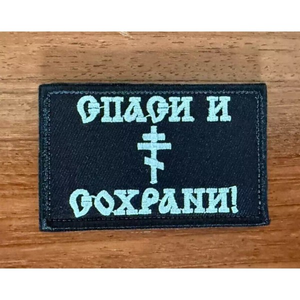 This patch features the traditional Orthodox Christian phrase "Спаси и сохрани!" ("Save and Protect!"), accompanied by a detailed image of a Russian Orthodox cross. It is designed in a bold, minimalist style with white embroidery on a black background, making the lettering stand out clearly.