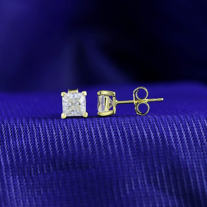 - This 4-prong Solitaire Princess Stud Earrings For Womens Engagement Wedding is made with 18K Yellow Gold Over Sterling Silver, allowing the beauty of the Synthetic Moissanite Diamond to truly shine. This Created Moissanite Diamond Stud Earrings are an enchanting, effortless look she'll love