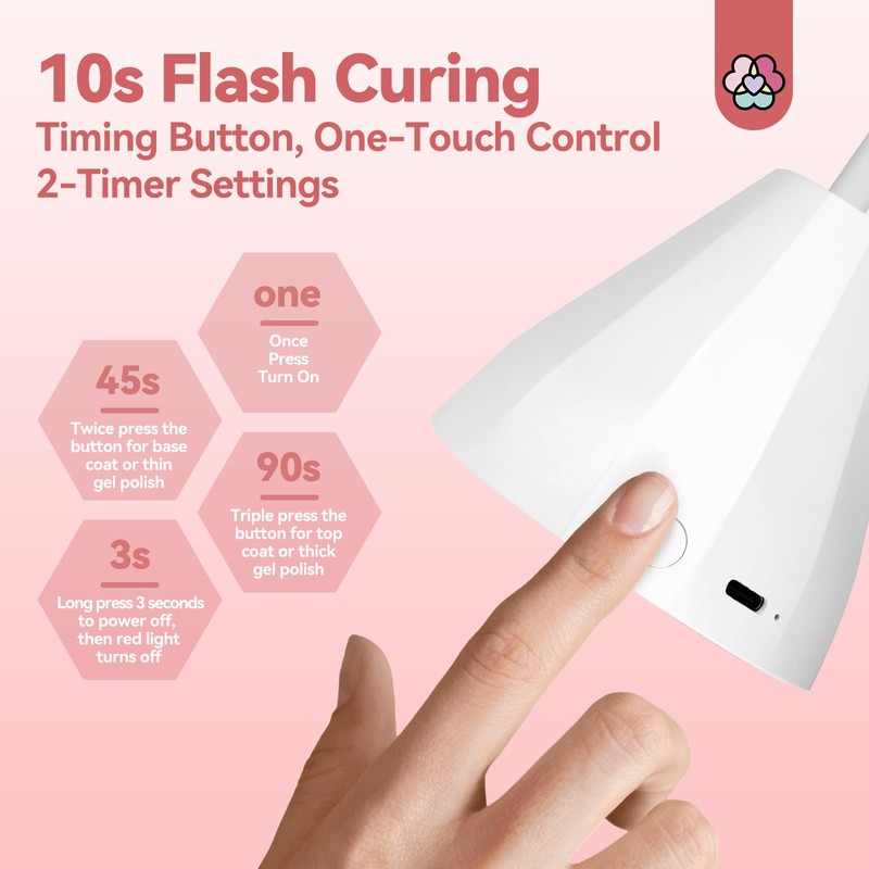 - Hands-Free Operation: With smart sensors and two timing modes((Default: 45s;Second: 90s), this nail lamp offers convenient, hands-free operation for quick drying at home or in salons