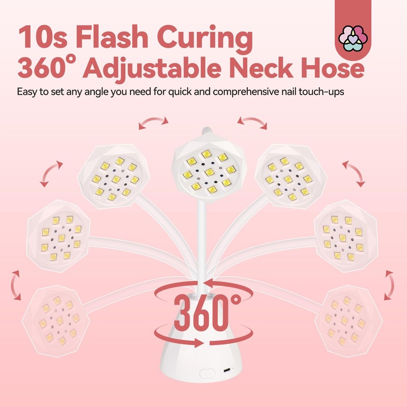 - Flexible Design: The LED UV light boasts a 360° rotating gooseneck hose for convenient angle adjustments. Its portability allows for quick nail touch-ups while traveling