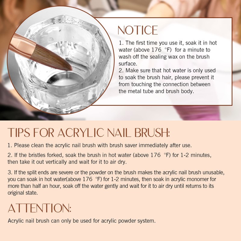 - ❤ 【MEJOR SERVICIO】 Después de cada uso, acrílico transparente se agrupa de las cerdas con una almohadilla de algodón. Remoje instantáneamente el cepillo en líquido acrílico para limpiar y evitar el apelmazamiento. Recuerde cepillarse suavemente y evitar el remojo excesivo para evitar el deshilachado de las cerdas. Si tiene algún problema, contáctenos en cualquier momento, haremos todo lo posible para ayudarlo.