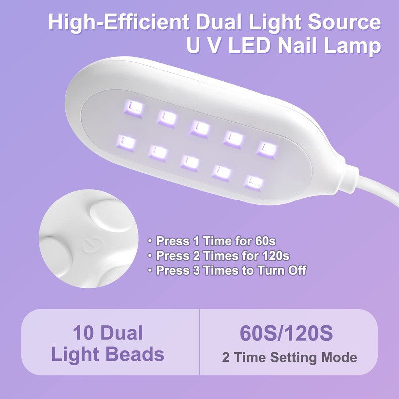 - Diseño de cuello de cisne giratorio de 360° y alta eficiencia: la luz Saviland U V para uñas tiene una manguera de cuello de cisne que se puede doblar 360 grados libremente, lo que te permite ajustar de forma flexible la altura y la dirección de la luz, siempre encontrando el lugar ideal para curar tus uñas. La lámpara LED de uñas soporta el secado de todo tipo de geles de uñas. Con fuentes de luz duales U V y LED y una potencia máxima de 30 W, 10 cuentas LED, batería autónoma, recargable para usar, con una duración perfecta de la batería, potente y eficiente.