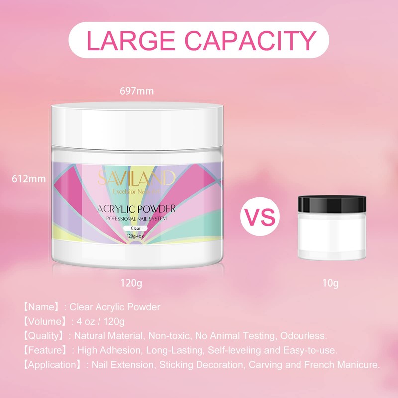 - 【ALTA CAPACIDAD Y CALIDAD DE SALÓN】. SAVILAND gran capacidad de polvo de acrílico transparente está disponible hasta 4oz/120g, que se puede mezclar con polvo extrafino de tiza pastel suave o glitters, DIY más encantador uñas de acrílico. Polvo de uñas de acrílico transparente es maravilloso para hacer uñas francesas, uñas de acrílico, flores talladas, extensiones de uñas y decoración de uñas.(Nota: Recientemente nuestro embalaje del producto se ha actualizado, el viejo y el nuevo embalaje será enviado al azar.)