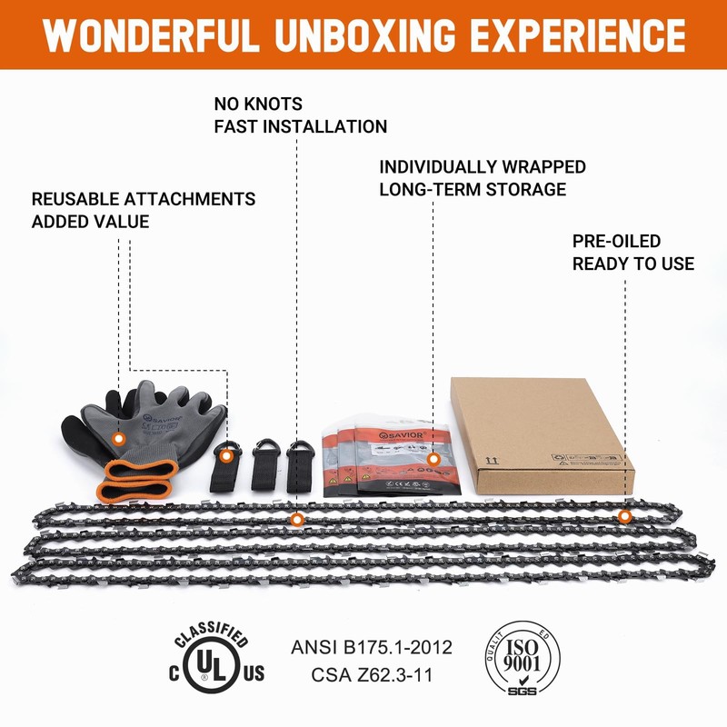 - 【Savior 72 Drive Links Chainsaw Chain Feature】: High performance and lightweight with low kick design for improved saw safety. Each rivet undergoes heat treatment and quenching processes to make the connection between the chain links stronger. Not easy to break. Every saw chain comes protective oil to the surface, resists wear and improves strength, reducing chain tension changes, and allows the machine to operate more smoothly.