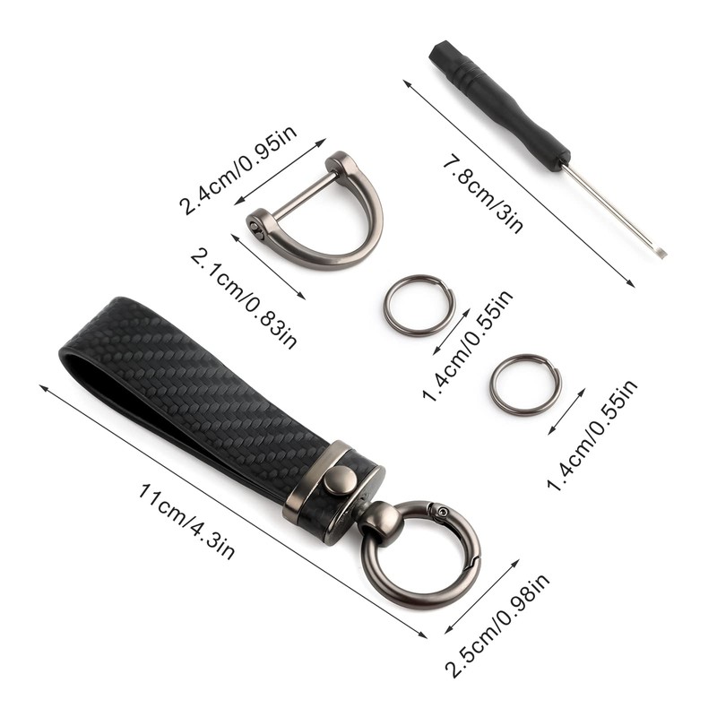 - Package Content: You will receive 1 carbon fiber car keychain, 1 D-ring, 2 small keyrings and 1 screwdriver. The keychain is about 4.45inch / 11.3cm in length and 0.99oz / 28g, easy to carry.