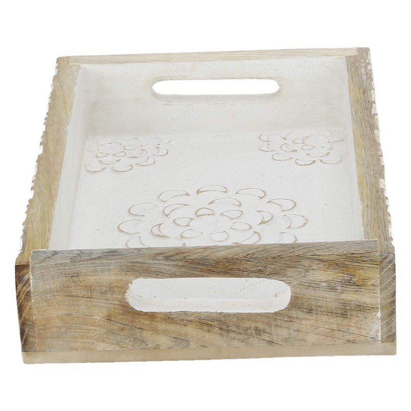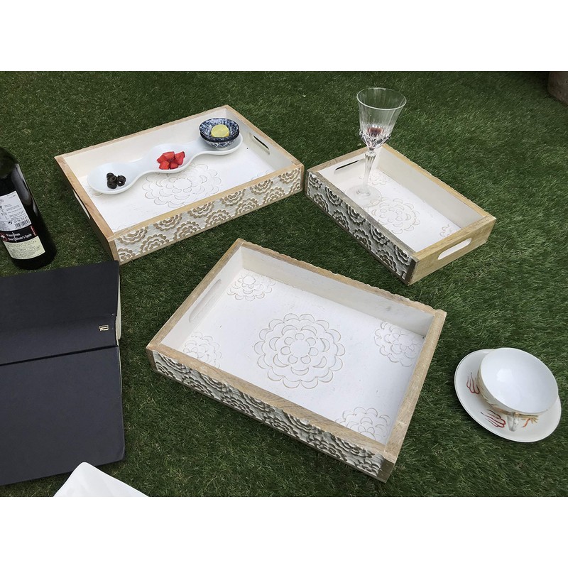 SAVON Rustic Wood Tray set of 3 torched nesting hand carved set white flowers wooden