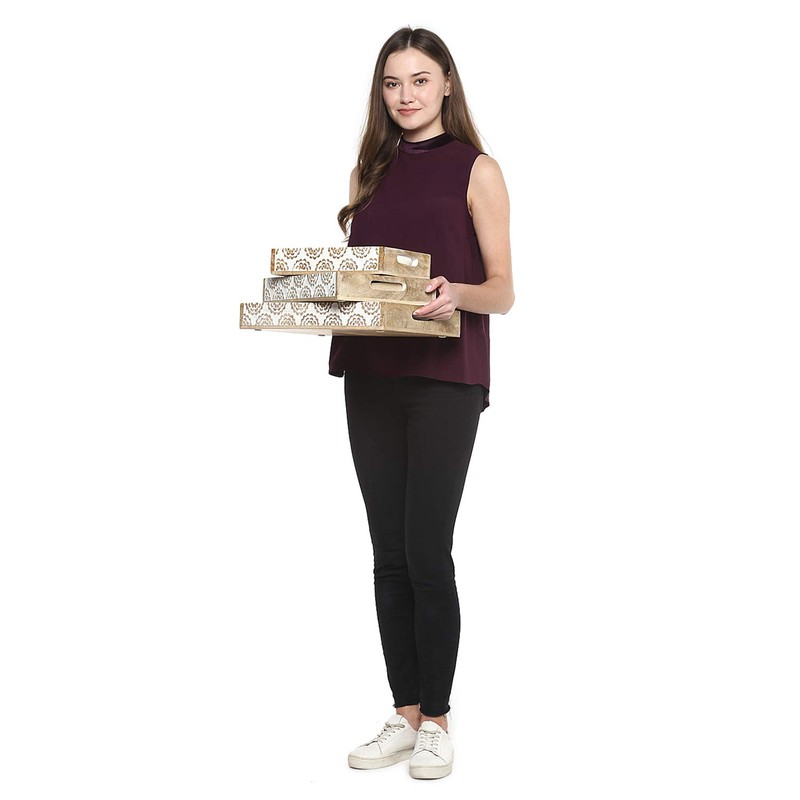 - EASY STORAGE - Nested set of 3 wood trays provides easy storage when not in use, whether in the cupboard or on top of the counter