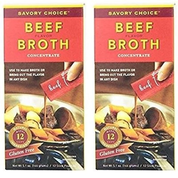 Savory choice beef broth concentrate is fresh homemade flavor from natural ingredients. Savory Choice Liquid Beef Broth Concentrate has roasted beef flavor without MSG. Gluten free and Trans fat free. Tired of discarding the 1/2 used box of broth in your refrigerator because you cannot remember how old it is? Now you can make as little as 1 cup of broth at a time and eliminate waste. Each box contains 12 stick pouches which makes the same amount as 3 x 1 quart boxed broth (96 fluid ounces). Use in soups, stews, gravies and casseroles.