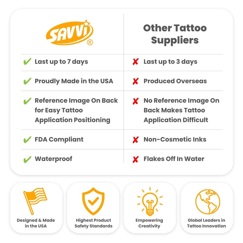 - SKIN-SAFE INK: We use skin-safe, cosmetic-grade, and FDA-compliant ink, so these tattoos are as safe as they are fun! Enjoy the dynamic appearance of our tattoos for up to 4-7 days with proper care.
