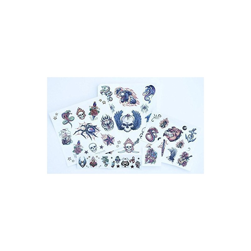- Images feature eagles, winged skulls, pirate ships, snakes, guitars with roses or flaming background, tigers, flaming stars, spiders, dice, sharks, dragons and more. All tattoos are pictured between the 2 images shown on this product page.
