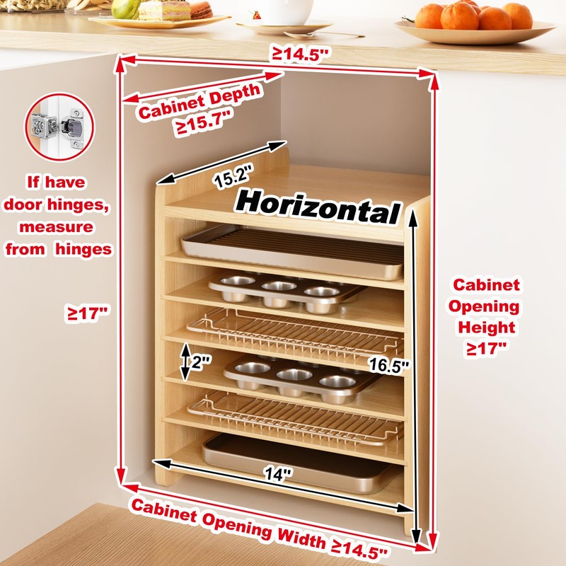 - Pay Attention to The Size: The size of wooden kitchen cabinet tray dividers is approximately 14" W x 16.5" H x 15.2" D, the cabinet size should be at least 14.5" W x 17" H x 15.7" D (vertically placed), 17" W x 14.5" H x 15.7" D (horizontally placed). To ensure normal use, please measure the cabinet size before purchase!