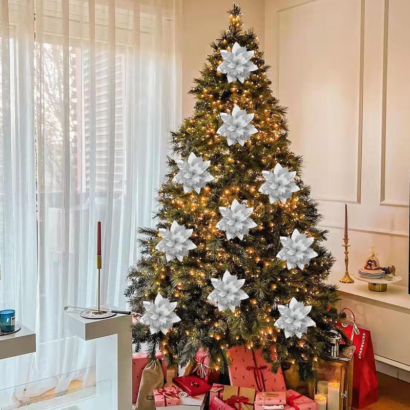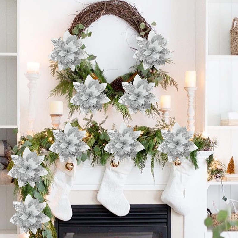 Sawowkuya 15 Pcs Silver Poinsettia Artificial Flowers Glitter Artificial Christmas Flowers Decorations with Clips for Xmas Tree Ornaments Wedding Party Wreath Decor
