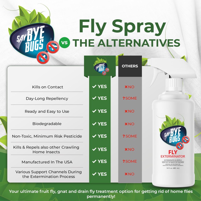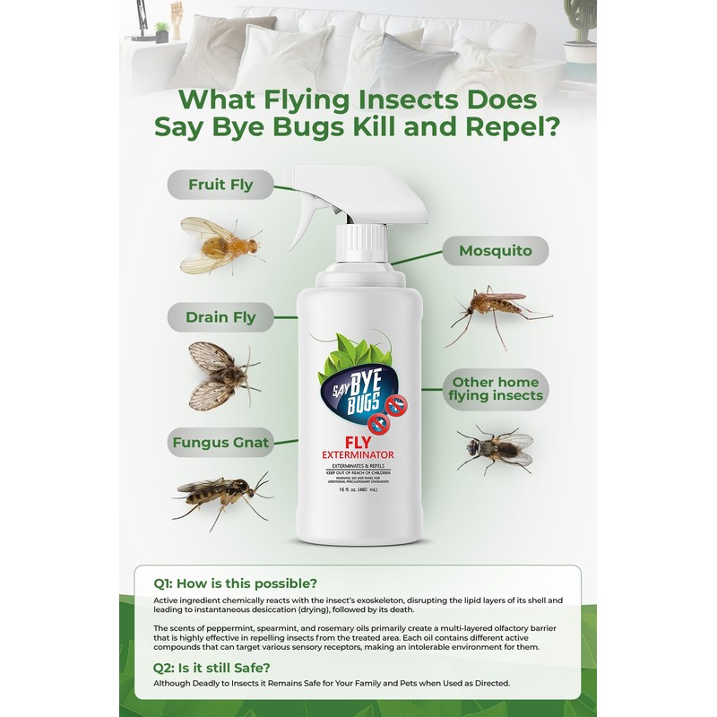 Say Bye Bugs Fly Exterminator. Non-Toxic Insect Killer That Eradicates on Contact & Provides Daylong Repellency. for Fruit Flies, Gnats and Other Flying Home Insects. Shake & Spray (6X 16oz).