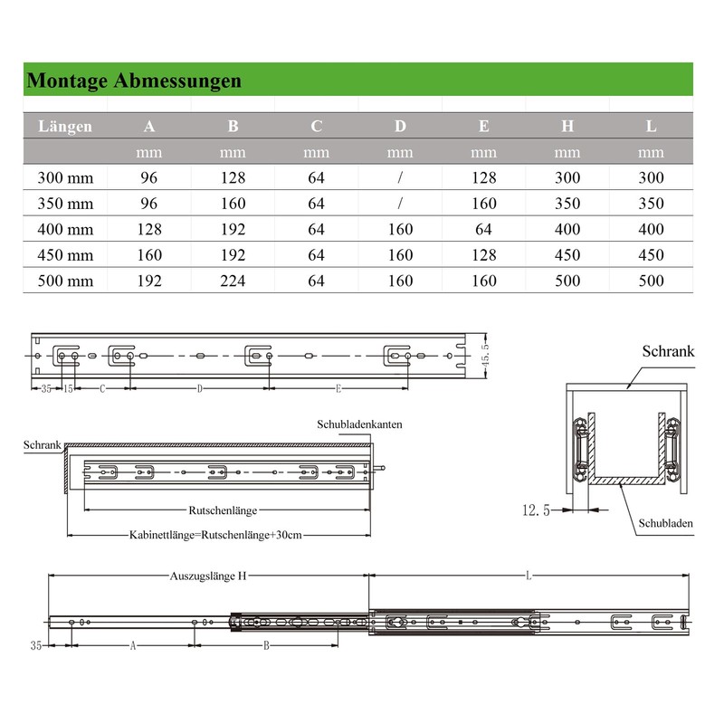 SAYOYO offers a wide range of drawer rails in different lengths. 300 mm (11.81 in), 350 mm (13.78 in), 400 mm (15.75 in), 450 mm (17.72 in) and 500 mm (19.68 in). You can choose the size of the rail according to the length of the drawer.