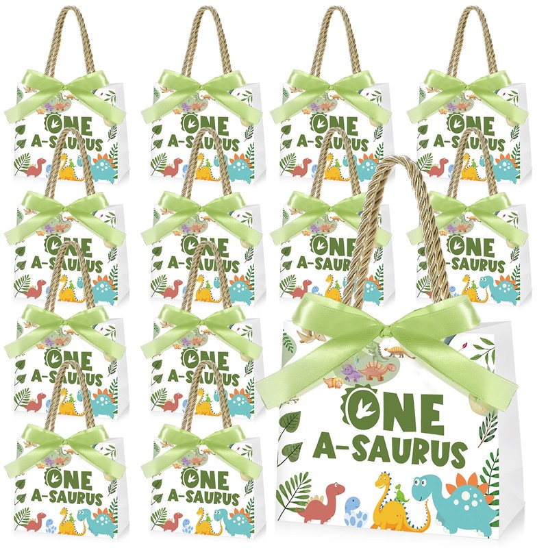 - Dinosaur Party Favors: these dainty dinosaur gift bags 1st birthday decorations are perfectly designed to celebrate the first milestone birthday; Mainly crafted with durable paper material, they're as sturdy as they are lovely, matching the celebration's joyous atmosphere