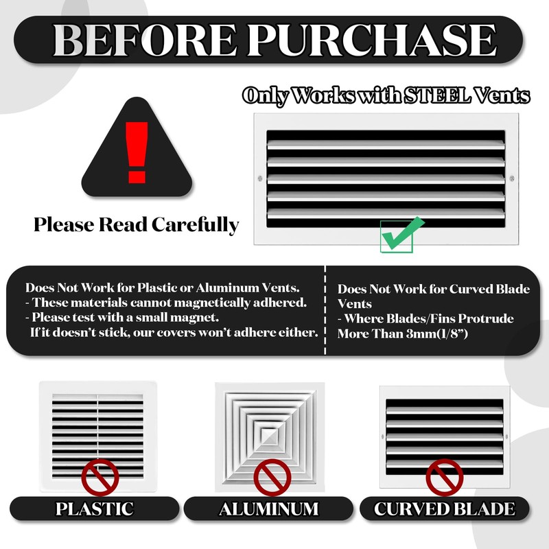 - Warm Notes: our square magnetic vent covers are suitable for magnetic metal material, otherwise it will not stick; NOT suitable for aluminum, wood, or plastic vent; The vent covers for wall has a certain thickness and weight, but it does not affect its function and use; Please check size before ordering
