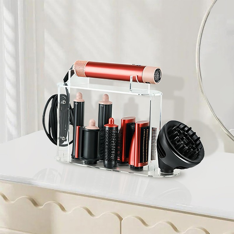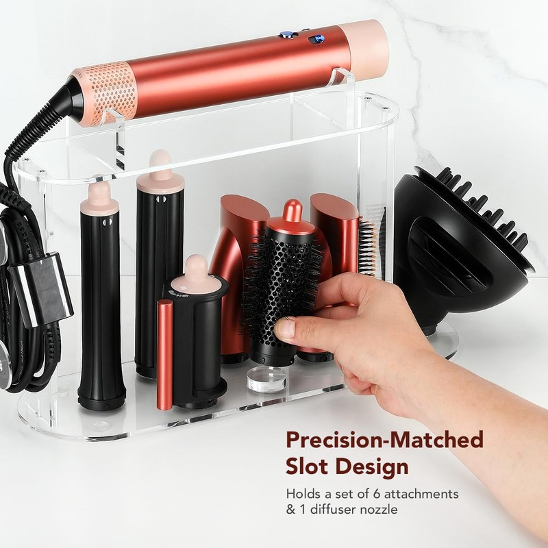 - Upgraded 7-Slot Dyson Airwrap Organizer C Designed specifically for the Dyson Airwrap Styler, this premium acrylic stand now features an enhanced layout with 7 custom-fit slotsincluding a dedicated holder for the diffuser attachment. It accommodates all key accessories securely, even the extended 7.48" barrel, keeping your styling tools neatly displayed and always within reach.