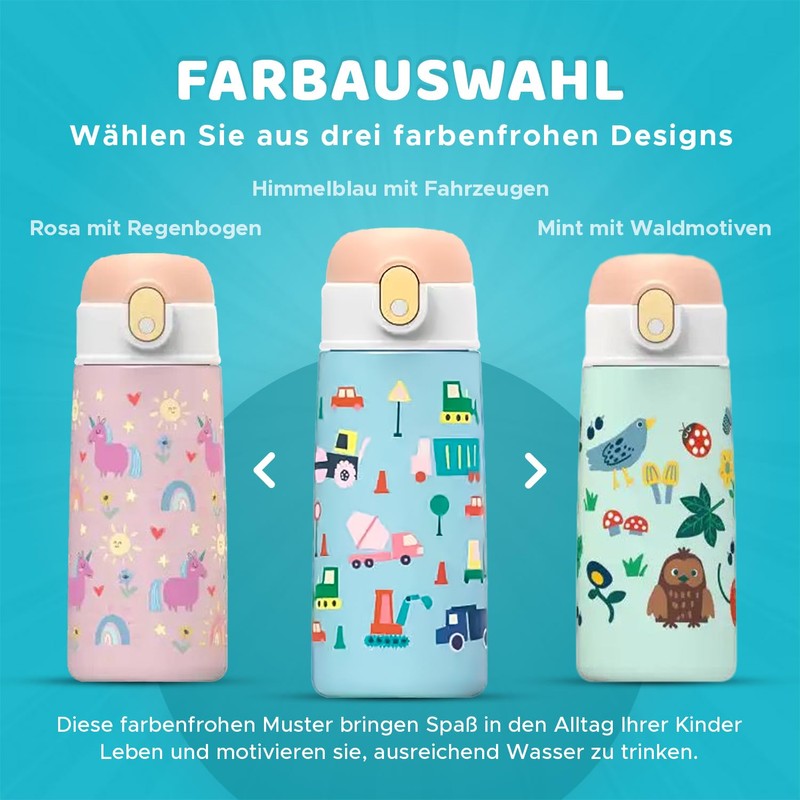 - Lively choice of colours: choose from three colourful designs - sky blue with vehicles, pink with rainbows and mint with forest motifs. These colourful patterns will bring fun to your children's everyday life and motivate them to drink enough water.