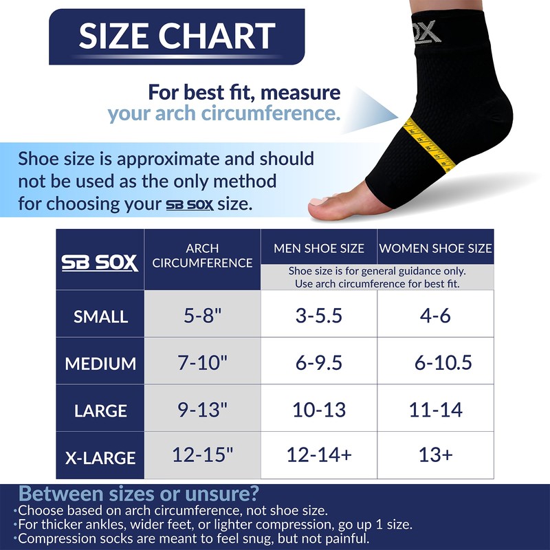 - Find Your Perfect Fit C Arch-Based Sizing: For best results, measure your arch circumference (not shoe size). If you want lighter compression, have thick ankles or wide feet, go up one size. SMALL: 5C8 arch | MEDIUM: 7C10 arch | LARGE: 9C13 arch | X-LARGE: 12C15 arch.