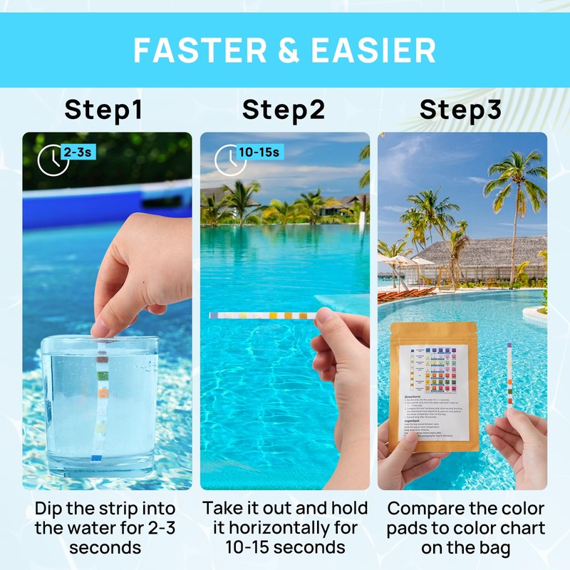 - Easy to use: each pool test strip is colour-coded for easy reading. Simply immerse the strip in the water for a few seconds. You get instant accurate results and ensure the optimal balance for safe swimming.