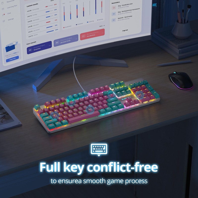 - 【PBT Keycaps for Durability】Equipped with high-quality PBT keycaps, this mechanical keyboard offers a premium typing experience and exceptional wear resistance. The keycaps maintain their texture and clarity even with prolonged use.