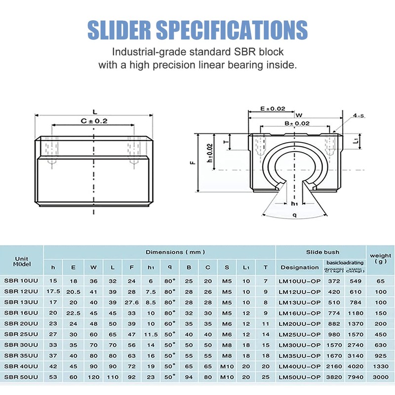 CNCMANS has been committed to providing superior 3D printers and accessories services.The linear track is uniformly stressed, sliding smoothly, made of carbon steel, corrosion-resistant,and high-temperature resistant.The linear bearing can travel infinitely together with the cylindrical shaft. Because of pointcontact between ball and straight axis, so the load is small. The ball is spinning with the smallestfriction, it can run a high precision and smooth motion.Flange linear bearings can be divided into:round flange type, oval flange, guide wheel flange, guide the oval flange type, plus long roundflange type.The shaft is case hardened. If you use normal steel shafts, the bearings will cut them up in notime. So make sure what you buy is case hardened!Specifications:Brand: CNCMANSModel: SBR20Shaft Diameter: 20mmSBR20 Linear Rail Kits Includes:2x SBR20-1000mm Linear Slide Guide Rails4x SBR20UU Bearing BlocksFeatures:Steel material and hardened caseHigh accuracy and strong durabilitySmooth moving, low friction, high rigidity and long working lifeSuits X, Y, Z axis,perfect items for your CNC project
