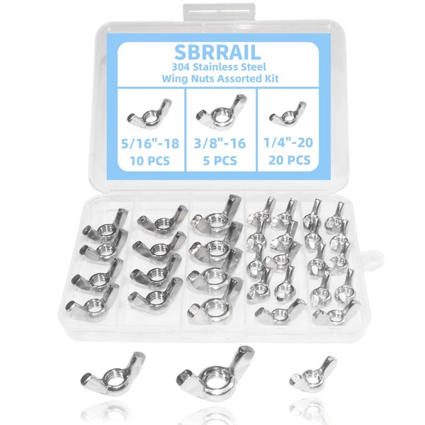 SBRRAIL Wing Nuts Assorted Kit 3 Sizes 1/4", 5/16", 3/8" Butterfly Nut, Stainless Steel Hardware Nuts, Fasteners Parts Screws Hand Twist Tighten Ear Butterfly Wing, 35 PCS