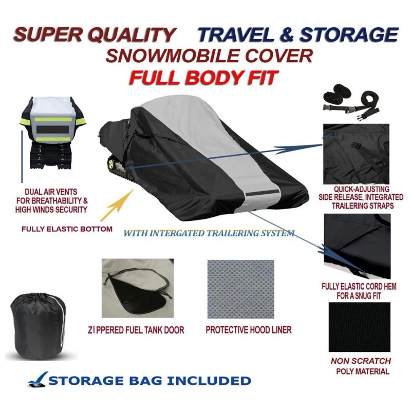 Full Body Travel and Storage Snowmobile Cover with integrated trailering system- Great all weather protection for your snowmobile. This snowmobile cover covers full body of your snowmobile including ski tips -No need to worry any longer about your snowmobiles front suspension components. PACKAGE INCLUDES: This snowmobile cover is a great solution during transport or for storage indoors and out. Our travel snowmobile covers are manufactured from technologically advanced, high quality,poly material to protect your snowmobiles all year round. This snowmobile cover is durable and has been designed to provide resistance to mold, mildew, sun, ice, snow, dust, dirt as well as other environmental hazards.