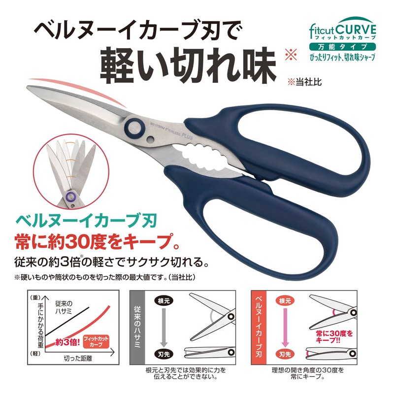 プラス はさみ フィットカットカーブ 万能はさみ ネイビー 紙も金属も切れる SC-175PM 34-631