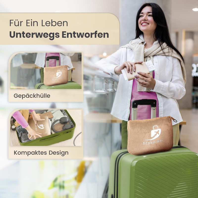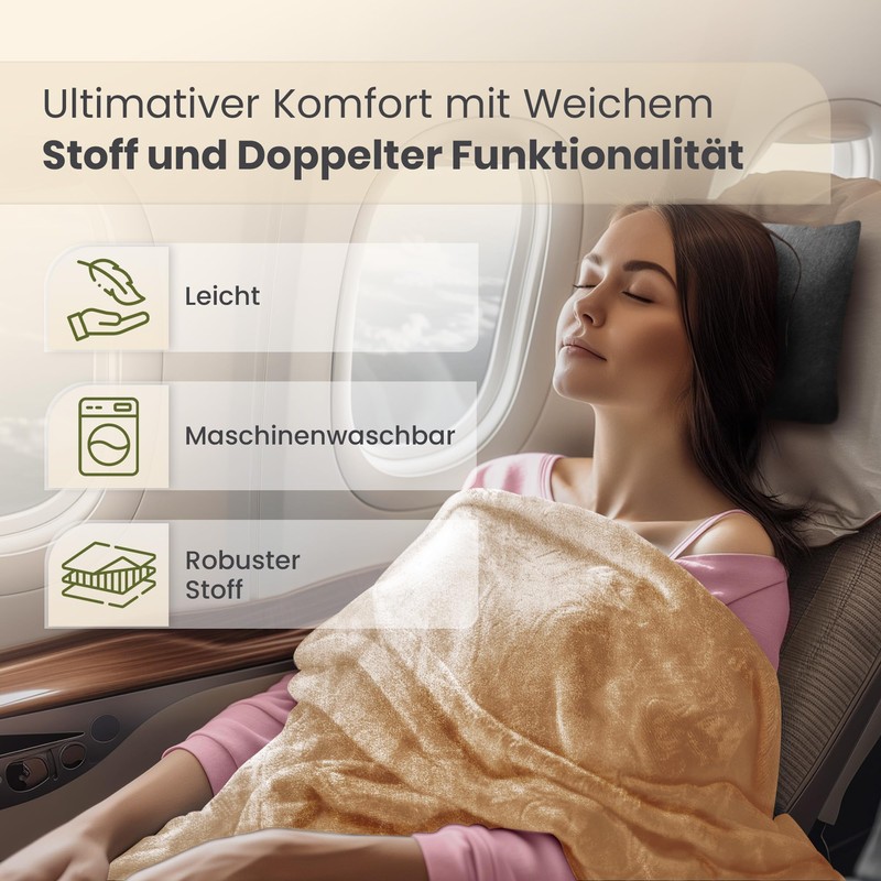 SCANDIWAY 2-in-1 Travel Blanket & Pillow - Soft Premium Airplane Blanket with Pillow Case, Carry On Strap & Backpack Clip (Beige)