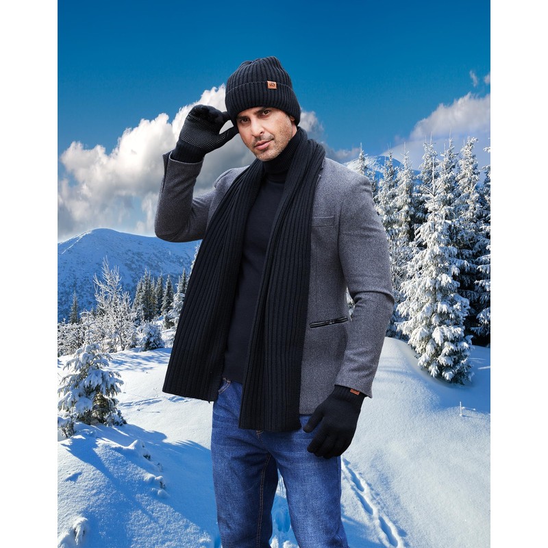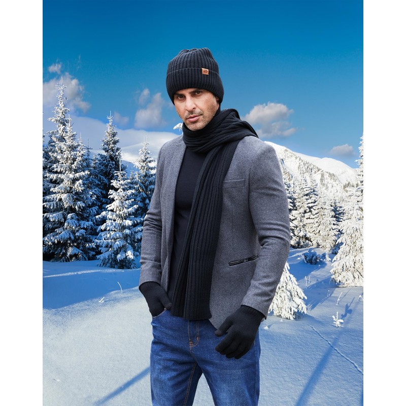 Scarf Sets for Men, Beanie Knit Hat Touch Screen Gloves and Long Warm Winter Scarf