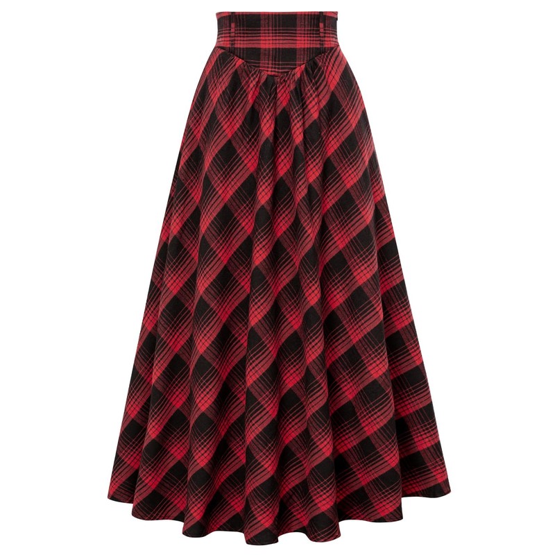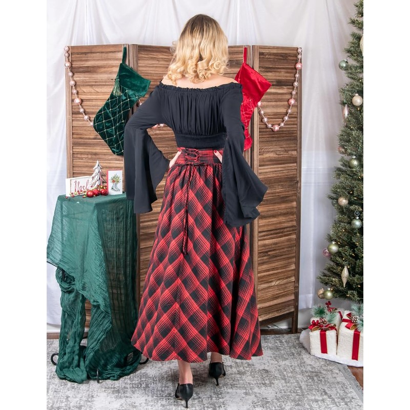 SCARLET DARKNESS Women's Victorian Costume Skirt High Waist Lacing Medieval Maxi Skirt, Red Black Plaid