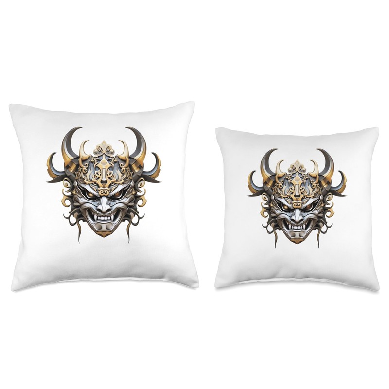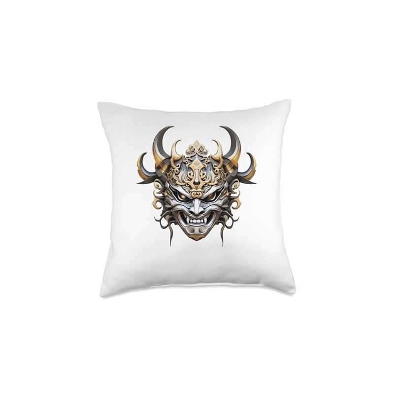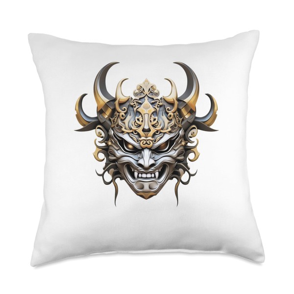 Scary Golden Yokai Oni Mask Japanese Anime Warrior Throw Pillow