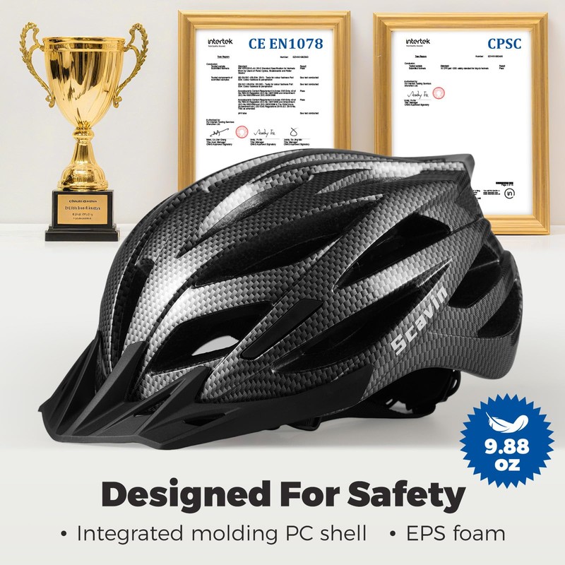 - Dual Safety Certified - Scavin adult bike helmet complies with CPSC(US) and CE(EU) safety standards. It features a reinforced PC shell with a thickness of up to 0.7mm,-embedded with one-piece EPS foam to protect the head in a collision.