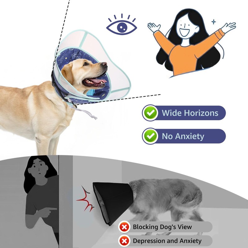 - EFFECTIVE PROTECTION: This extended cone for dogs to stop licking effectively prevents wound licking, biting, or scratching, promoting faster healing. The clear section folds up temporarily for easy eating and drinking