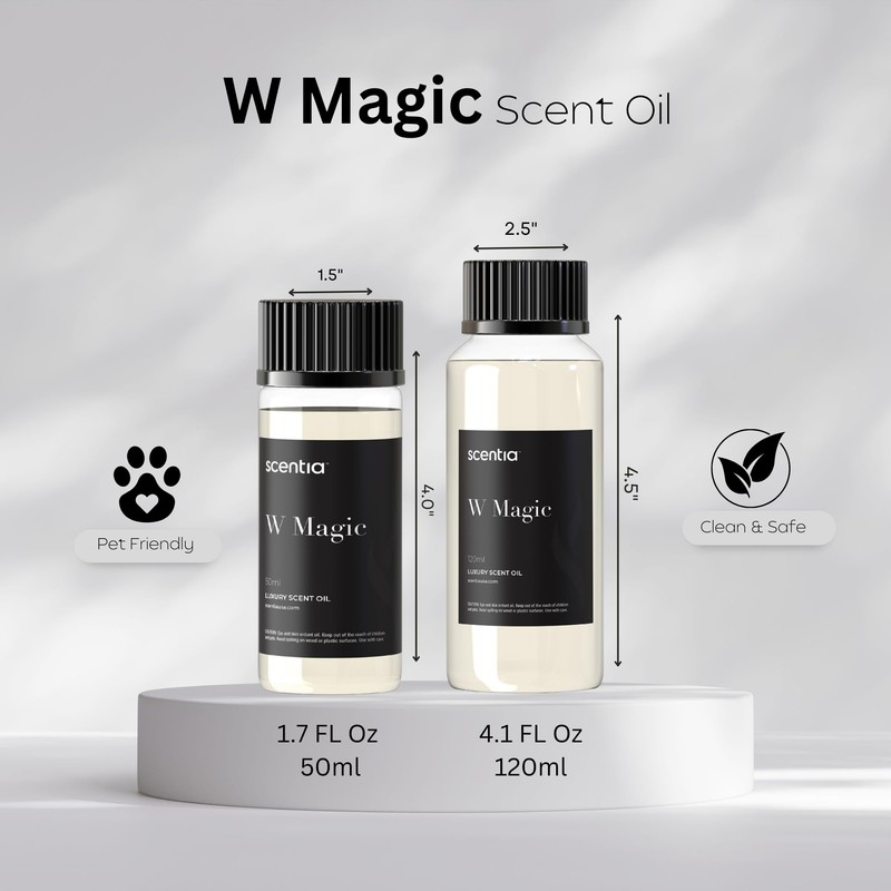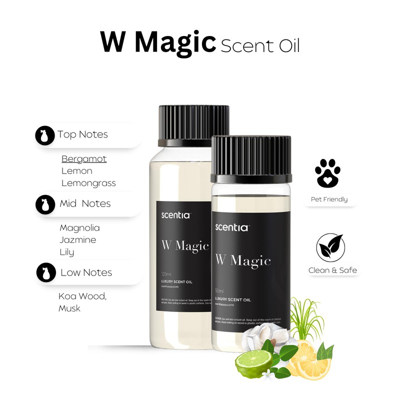 - KEY NOTES : W Magic Diffuser oil features hints of white tea, a delicate floral mix of Italian bergamot, fresh lemongrass, woody cedar, and vanilla, this fragrance evokes a sense of cleanliness, freshness, and lightness