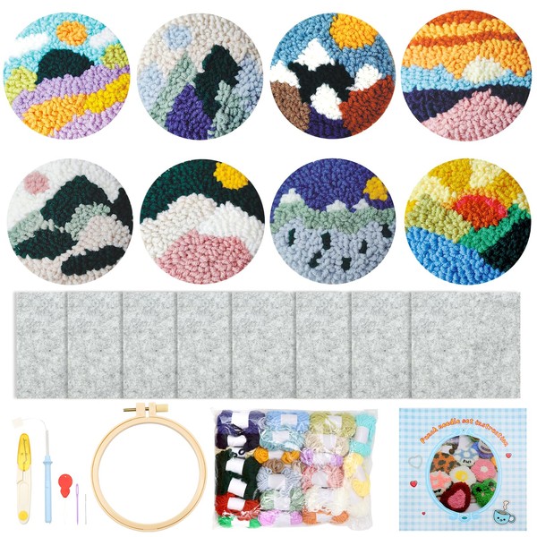 Scettar 8 Pcs Punch Needle Embroidery Kit,DIY Punch Needle Coasters Craft Set with Tools,Patterns,Yarns,Hoop and Instruction,Perfect Decoration and Gifts for Beginners Kids Adults