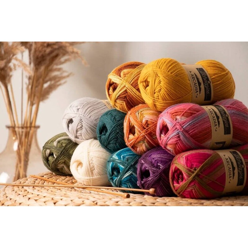 :: Scheepjes Yarns :: Go on an adventure with Scheepjes Arcadia! Scheepjes Arcadia is a gorgeous sock yarn, inspired by impressive landscapes from all over the world. It is a wear-resistant yarn made from 75% Superwash Virgin Wool and 25% Polyamide in both striped colorways and solid colors. The yarn is warm but still has the breathable quality of wool. It is wear-resistant and easy to care for, thanks to the polyamide component. Arcadia has great stitch definition, feels slightly rustic to the touch, but softens during use. The Scheepjes Arcadia collection offers both striped colorways and solid colors, which grants plenty of options for creating your very own knitted socks. For example, you can knit a striped sock with heel and toes in solid shades. Arcadia is of course also suitable for all sorts of clothing and accessories, such as sweaters and scarves. |