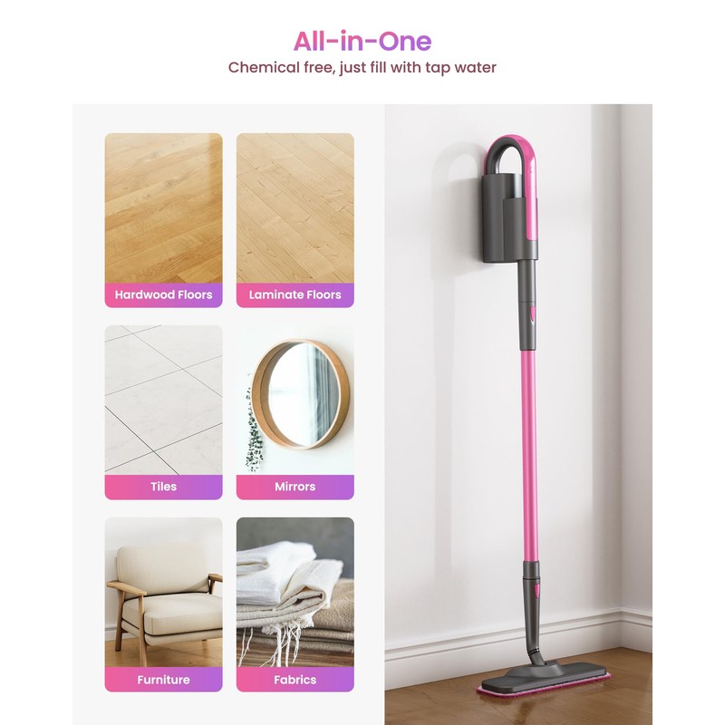 - [Instant Heating] Simply add tap water to the floor steamer, and it will be ready in just 15 seconds. The mop head also effortlessly sweeps under the shelves, behind the toilet seat, and in between narrow spaces, so you leave no hard-to-reach corners behind