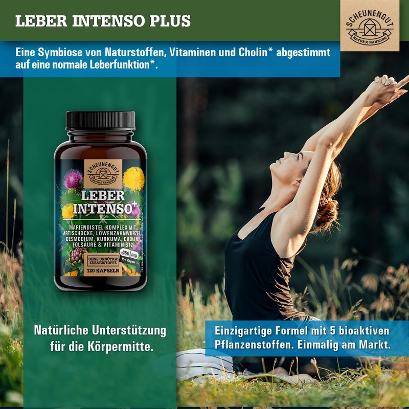 Scheunengut LIVER INTENSO?+ Liver Capsules High Dose - IMPORTANT: Laboratory-tested with choline, milk thistle, artichoke, dandelion, desmodium PLUS 80% silymarin and 5% cynarin -DE- SCHEUNENGUT?