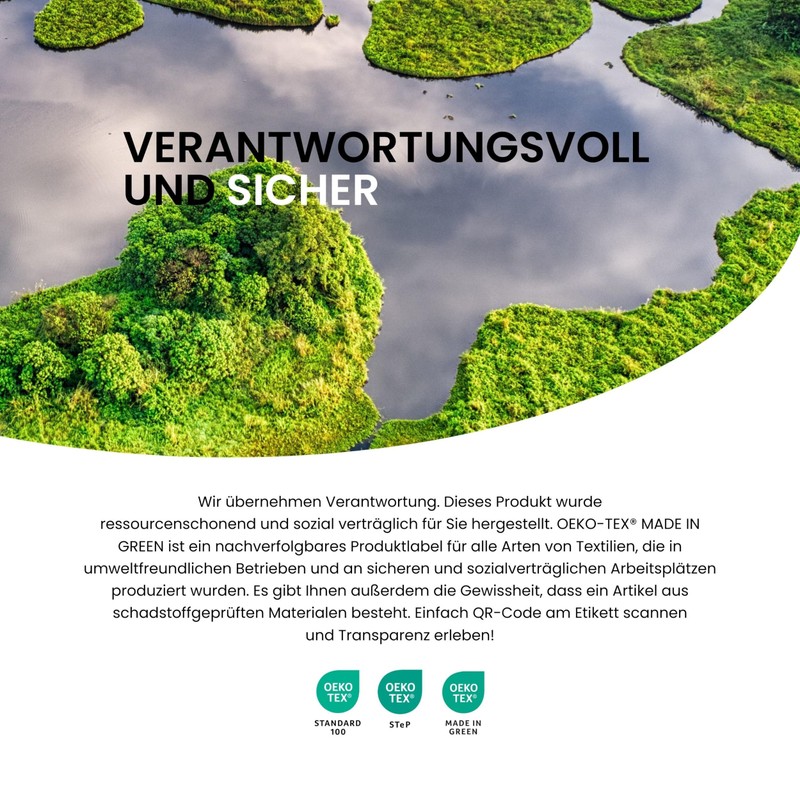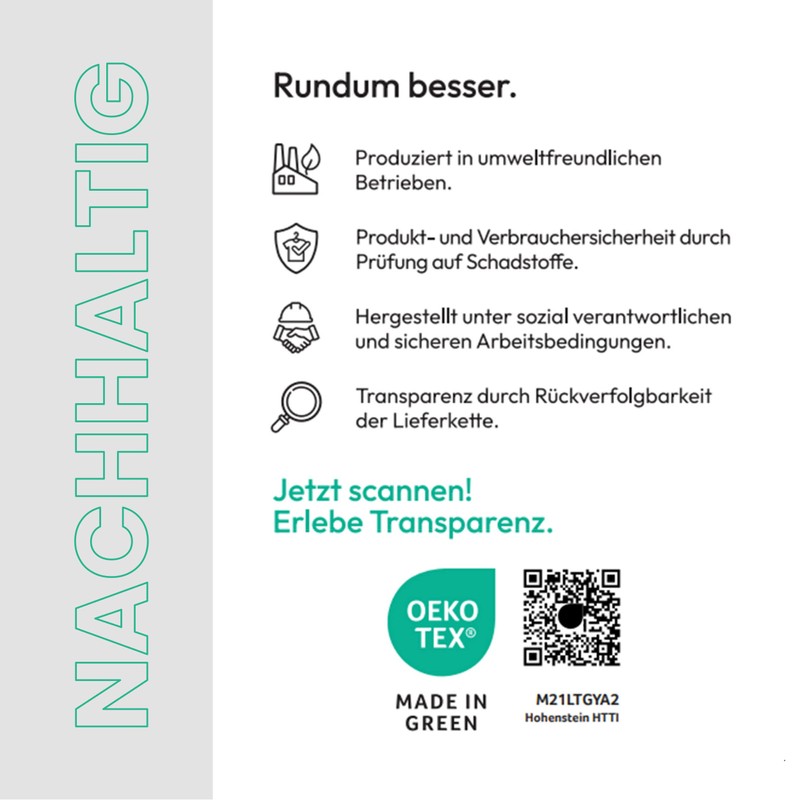 - Safe and fair. Free from harmful substances according to Oeko-Tex Standard 100 as well as resource-saving and socially compatible in Turkey for you, certified with Oeko-Tex Made in Green (M21LTGYA2 Hohenstein HTTI).