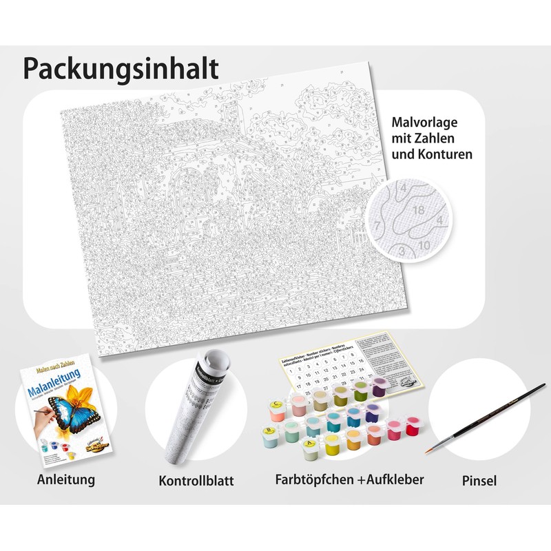 - Complete set - The package includes 24 water-based acrylic paints, a painting brush, instructions (English language not guaranteed), a template and a painting template measuring 24 x 30 cm